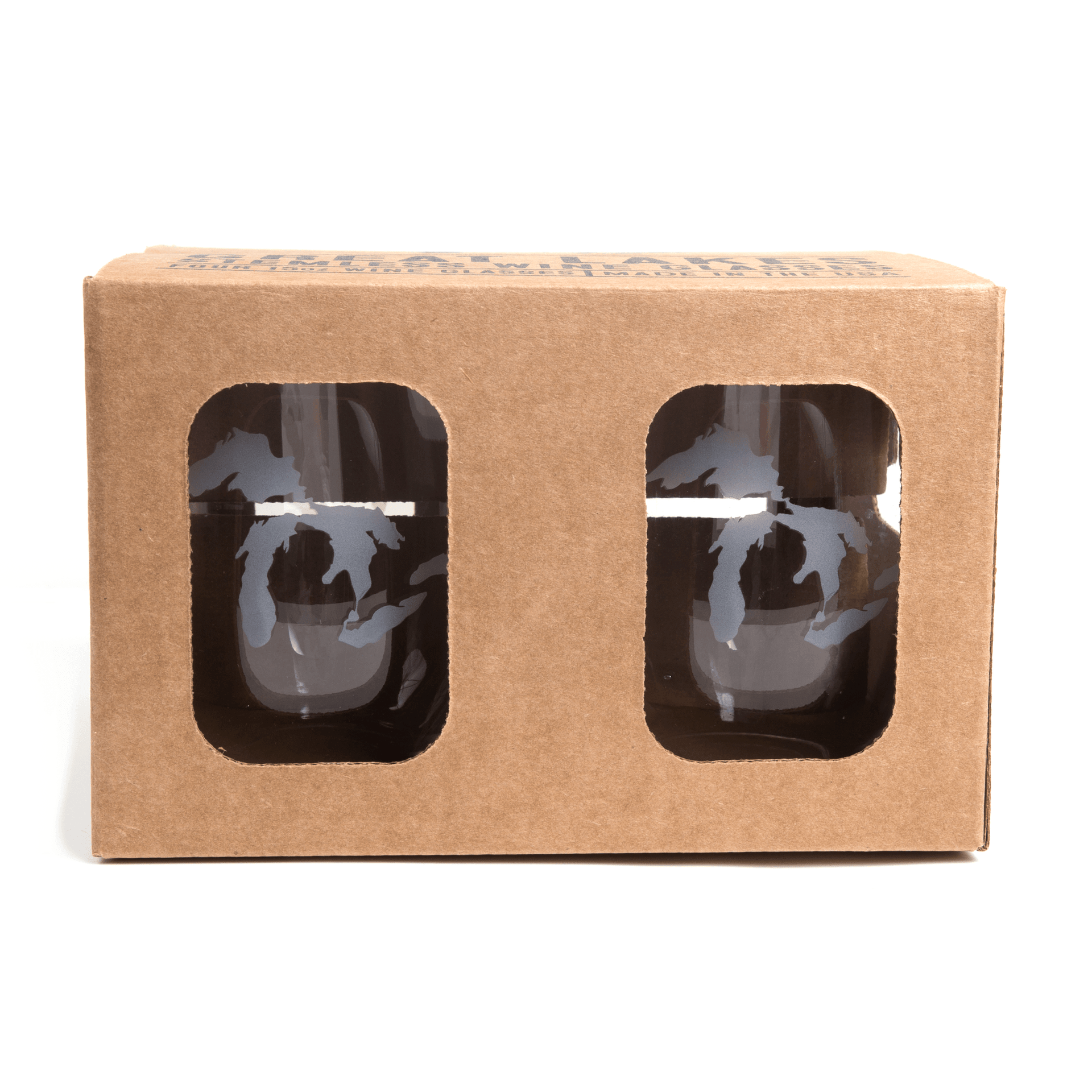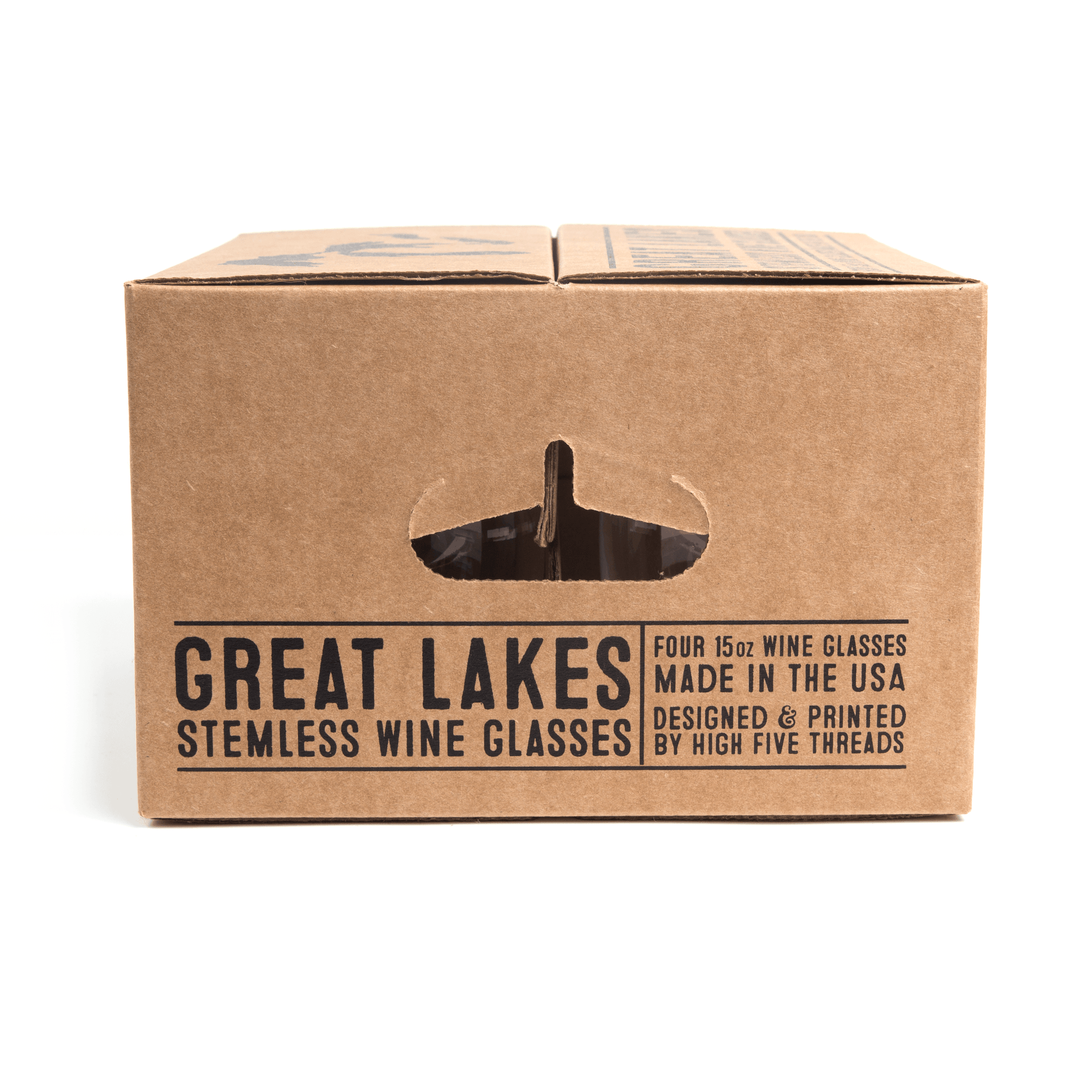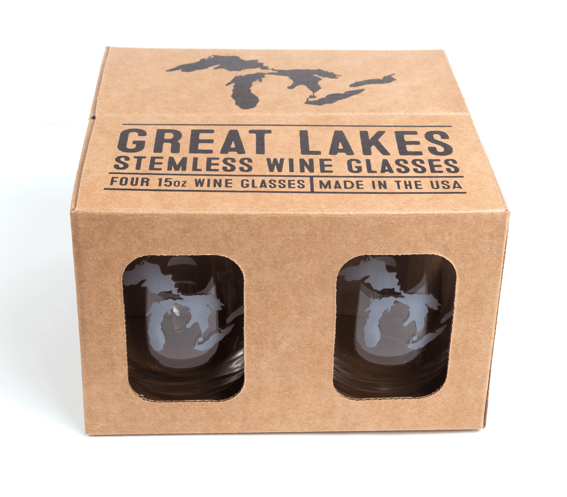 Our stemless 15oz wine glasses are proudly made in the USA and printed in Traverse City, Michigan and ready to go in this great 4-pack ready for gifting or your cupboard!