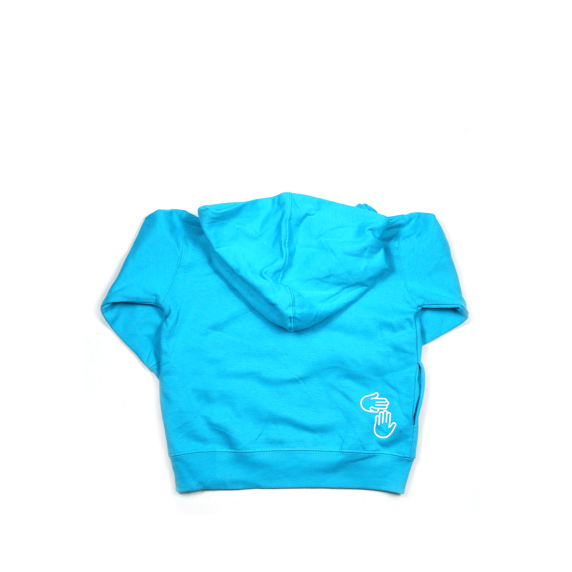 7.5 oz 50/50 Poly Cotton BlendBright Blue hoodie with white soft hand print.