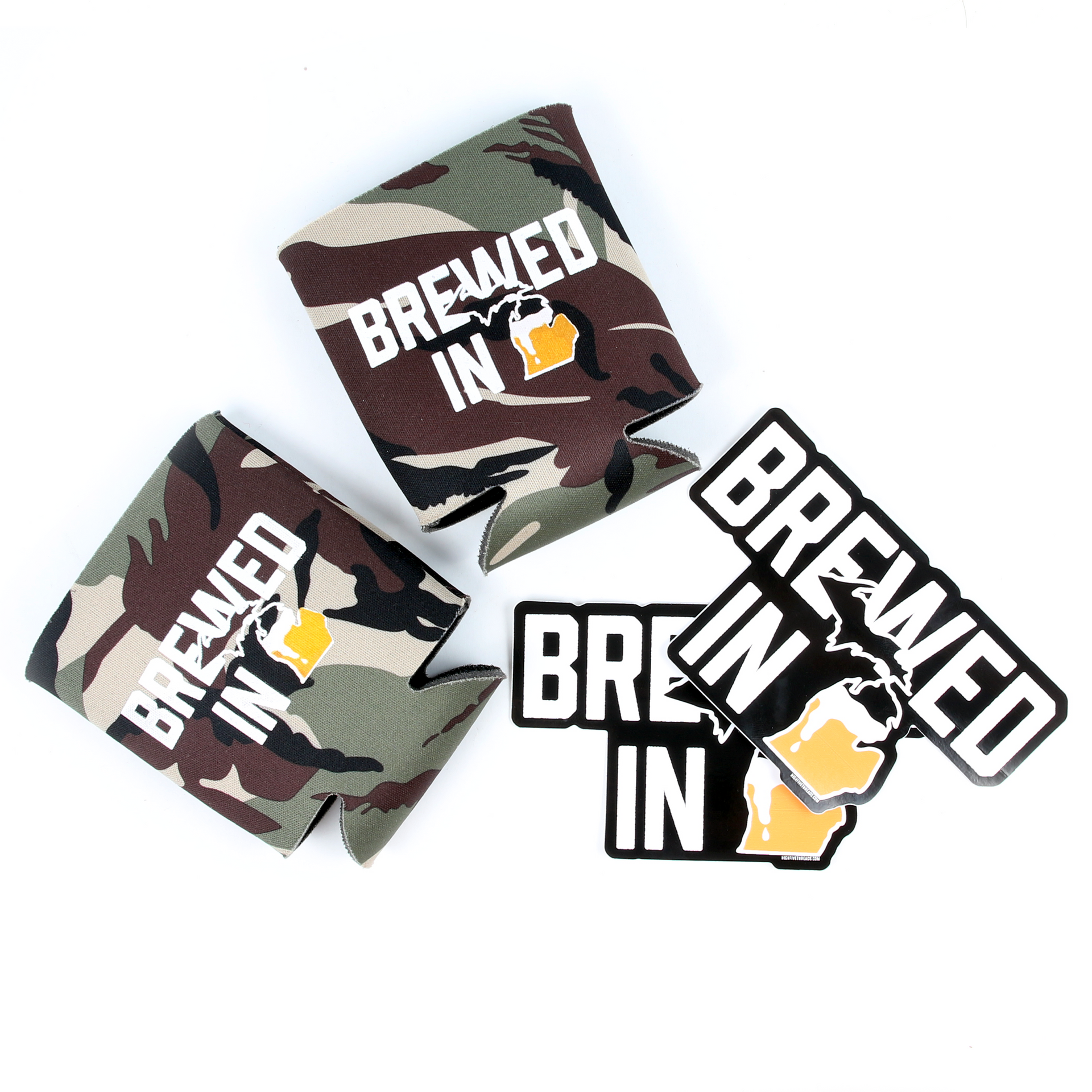 Brewed in Michigan Sticker and Can Hugger Bundle (Camo)